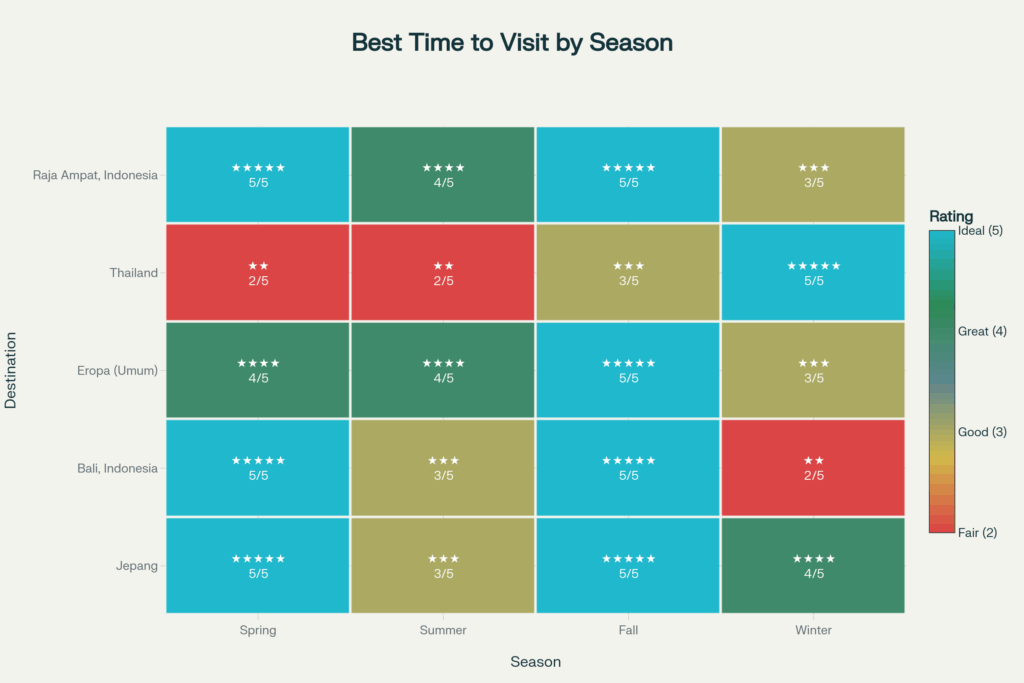 Untuk kebanyakan destinasi Indonesia, waktu terbaik adalah musim kemarau, dari April hingga Oktober, karena cuaca cerah dan cocok untuk aktivitas outdoor. Akan tetapi, beberapa destinasi memiliki waktu terbaik yang berbeda. Sebagai contoh, untuk Raja Ampat, Mei hingga September adalah waktu terbaik karena laut lebih tenang. Untuk Bromo, setiap waktu cocok dikunjungi, tetapi hindari bulan Januari-Februari karena banyak hujan.