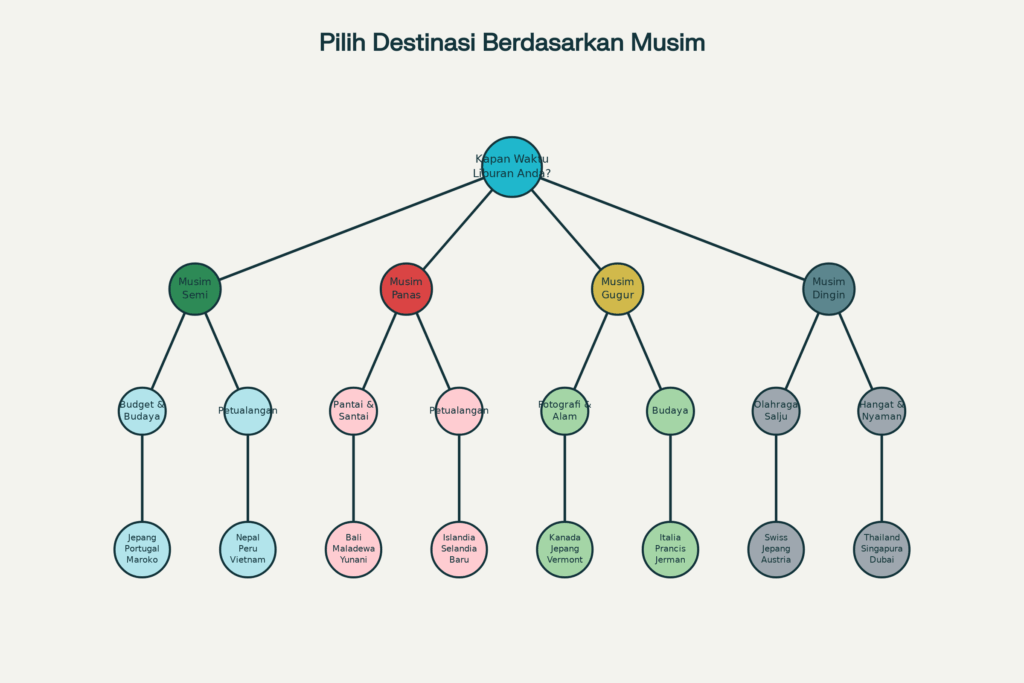 Pilihan destinasi tergantung pada apa yang kamu sukai. Apabila kamu menyukai pantai dan kehidupan malam, Bali adalah pilihan terbaik. Jika tertarik dengan sejarah dan budaya, Yogyakarta sangat cocok. Jika kamu pecinta menyelam dan snorkeling, Raja Ampat atau Wakatobi adalah tempat yang sempurna. Kalau menginginkan petualangan di gunung, Lombok dengan Gunung Rinjani atau Bromo dengan sunrise-nya yang terkenal bisa menjadi pilihan. Pikirkan apa yang paling membuat kamu bahagia, kemudian pilih destinasi yang sesuai dengan minatmu.